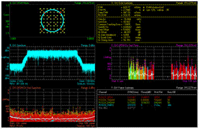 下一个系列的测量着重于传输质量,较主要的度量方法是EVM(error vector magnitude)。对于下行OFDMA,测量基于时域上的一个子帧(1ms)和频域上的12个子载波(180kHz)。上下限取决于调制复杂度,调制阶数越高,上下限越严格。对于来自UE的上行SC-FDMA信号,传输质量取决于已分配和未分配的资源块,需要分别测量通道内UE发射的频谱和其它带宽频谱。EVM和频谱平坦度用来说明已分配资源块的情况,带内泄漏和IQ 偏移(载波泄漏),这些降低网络性能的干扰信号详细说明未分配资源块的情况。