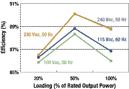 为了说明挑战之所在,让我们以某个工程师为例,其任务是采用符合80 PLUS银级性能规范的ATX电源设计台式PC。80 PLUS项目由北美地区的电力公用事业机构资助,旨在鼓励在台式PC和服务器中使用更高能效的电源。为了达到这个目标,80 PLUS银级规范要求电脑和服务器中的多路输出电源在20%和100%额定输出功率时拥有较低85%的能效,而在50%额定输出功率时能效较低为88%。