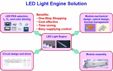 为了提供方便的LED照明解决方案和降低成本,Everlight提出并提供了LED照明引擎解决方案,它集成了LED选择、机械设计、光学设计、热管理、LED驱动器设计和组装的能力。这意味着LED照明客户可以从LED到完整模块的一站式购物,以节省设计时间和开发成本。图2所示为Everlight LED照明引擎解决方案的概念。