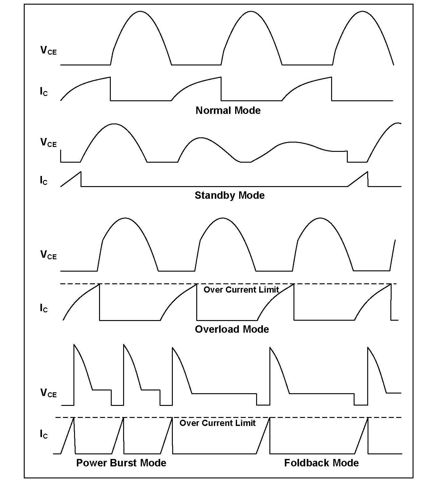 →电源突发模式——随着占空比的增加,控制器进入这种模式,周期性的折返模式有助于电源短路情况的恢复。