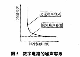 如果干扰电平的幅度虽然很大,但持续时间很短则也有可能不会对器件产生影响。比如,一个数字电路的输入端受到了干扰并且电平也超过了其直流噪声容限。干扰的不良影响是会引起此电路的误翻转。但是数字电路的翻转是需要一定时间的。如果干扰持续的时间很短,在此段时间内被干扰的数字电路没有来得及翻转,从实际情况看并没有构成对数字电路的干扰。如果考虑受扰电路的延迟时间这一因素,可以用交流噪声容限来进一步描述受扰器件的抗干扰能力。一个器件的直流噪声容限要比其交流噪声容限低,并且干扰的噪声脉冲频率越高、数字电路的传输时间越长,这种差别也就越大。图5定性地描述了这一性质。
