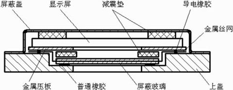 屏蔽玻璃安装完毕,待粘胶凉干后再装显示屏。为了防止终端内部电路的干扰,较后用屏蔽盖把显示屏包围起来。显示屏的屏蔽结构如图2所示。