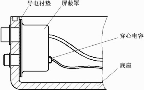 终端的通信连接器及电源输入插座安装在底座侧面,需要在侧面开口。为防止在开口处形成电磁泄露,可以在这些元件的后面装屏蔽罩,穿过屏蔽罩的引线加装穿心电容,焊接时引线通过穿心电容穿过屏蔽罩与元件相连。对于引入的电源插座,采用穿心电容实现电磁屏蔽。