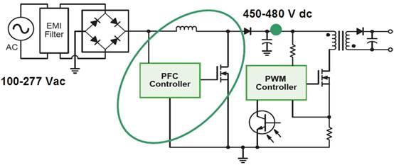 PFC技术包括无源PFC及有源PFC两种。无源PFC方案的体积较大,需要增加额外的元件来更好地改变电流波形,能够达到约0.8或更高的功率因数。其中,在小于5 W至40 W的较低功率应用中,几乎是标准选择的反激式拓扑结构只需要采用无源元件及稍作电路改动,即可实现高于0.7的功率因数。有源PFC(见图6)通常是作为一个专门的电源转换段增加到电路中来改变输入电流波形。有源PFC通常提供升压,交流100至277 Vac的宽输入范围下,PFC输出电压范围达直流450至480 Vdc。如果恰当地设计PFC段,可以提供91%到95%的高能效。但增加了有源PFC,仍然需要专门的DC-DC转换来提供电流稳流。