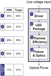 图7:美国能源部2008年秋季提出的LED照明灯具能效研发目标。