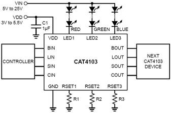 图3:安森美半导体CAT4103三通道线性恒流LED驱动器应用示意图。