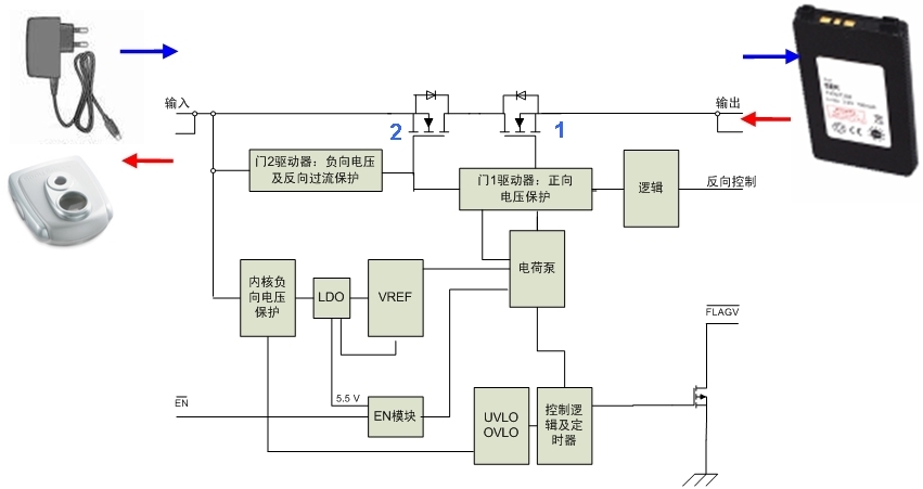 我们把普通墙式适配器或USB充电适配器到移动设备电池的通道称为直接充电通道,而把移动设备电池到外部附件(如调频收发器、负载扬声器和闪光模块)的通道称为反向供电/充电通道(参见图1