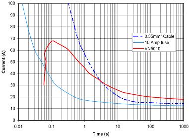 在图5的示例中有一个点,智能开关(VN5010)将继续前行,而电线将开始自毁(红线在蓝色虚线上方)。如果这种情况是真实的,甚至连电路板都可能会自毁。现在考虑到涌流要求很可能更加严格,我们开始意识到有必要开发一个能够仿真熔断器特性的保护算法。