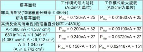 传统上,全球众多志愿性及规范机构的标准都着眼于降低电子产品的待机能耗,美国、欧盟等地的众多国际规范对电视产品的待机能耗要求为1 W,而中国中标认证中心(CSC)要求为3 W。而随着液晶电视尺寸越来越大,其能耗也越来越高。由于液晶电视市场份额越来越大,规范机构也越来越关注平板电视工作状态下的能耗对电网的累积影响。如“能源之星”发布了电视产品第3版工作能耗要求(见表1)。