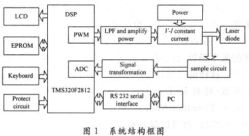 半导体激光器(LD)是一种固体光源,由于其具有单色性好,体积小,重量轻,价格低廉,功耗小等一系列优点,已被广泛应用。LD是理想的电子-光子直接转换器件,有很高的量子效率,微小的电流和温度变化都将导致其输出光功率的很大变化。因此,LD的驱动电流要求非常高,必须是低噪声、稳定度高的恒流源,一般电源很难满足要求。此外,瞬态的电流或电压尖峰脉冲,以及过流、过压都会损坏半导体激光器。这里将以TI公司的DSP芯片TMS320F2812为控制核心,实现带有多种保护的双闭环高精度半导体激光驱动电源系统。