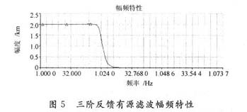 由式(3)可知只要将高频直流分量An滤除,改变PWM信号占空比q(q=O~1)时,可以得到输出电压O~3.3 V。由于三阶低通滤波器较之于一阶与二阶低通滤波器有更好的性能。采用“归一化”方法设计一个Butterworth三阶反馈有源低通滤波器,如图4所示。低通滤波器的传递函数表示为: