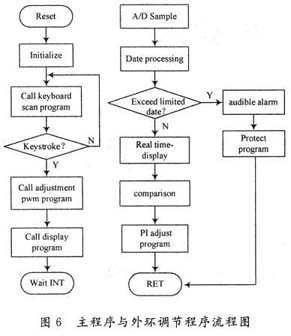 系统的初始化包括DSP外围接口芯片和电流给定的初始化,键盘扫描包括给定和步进量的调整。系统主程序与外环调节程序流程图如图6所示。