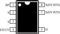 端“使能/欠压端”(EN/UV)。正常工作时由此端控制内部功率MOSFET的通断,该端还可用于输入欠压检测信号。另外,在旁路端(BP)内部还增加了6.3V的钳位保护电路。