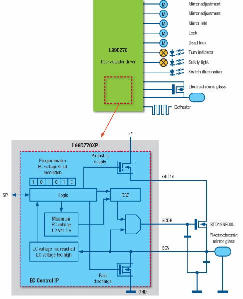 过去,在市场上有几款车门负载执行器驱动单元。这些元器件的特点是一个可扩展的执行器驱动概念,即这些元器件的软件和封装相互兼容,能满足车门电子模块衍生设计的重复性要求。这些驱动元器件支持所有的正常的车门区负载,如车门锁电机、后视镜调节、折叠、加热器(除霜器)以及从白炽灯到LED的各种照明功能。较近市场又出现了用单一元器件驱动所有车门负载的解决方案,这种元器件可产生驱动在车门上安装的系统所需的全部主要信号,提供了一个改进的电动防眩目后视镜控制方法。例如,意法半导体的L99DZ70XP一体化驱动芯片消除了通常在车门内部多个位置安装分立驱动器的要求,实现了一个紧凑的一体化的车门区控制,而且提高了安装简易性和长期可靠性。 L99DZ70XP还为一个驱动EC元器件的小的外部MOSFET提供控制信号(如图2所示)。这个架构可以节省空间和成本,还支持闭环电流控制,从而提高可靠性。