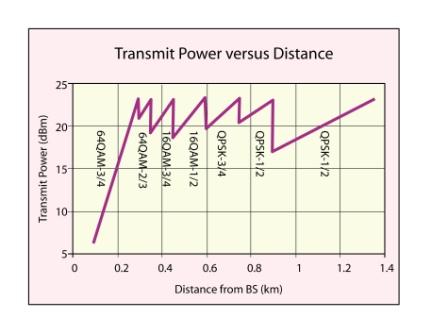 就以上一段的QPSK/16QAM例子来说明,假设一个发射器在+23dBm下工作,并刚达到了位于小区边缘范围时QPSK所需的5dB的SNR,当它向基站靠近时,路径损耗下降,基站可能通知移动台减小发射功率。然而,一旦路径损耗减小5.5dB,由于这时移动台能够获得10.5dB的SNR,故基站会指示移动台切换到16QAM-1/2调制方式,发射功率重新回复到+23dBm。所以,移动设备一般都以较高的功率进行发射,除非它靠向基站,近得可以转为采用16QAM方式工作(许多情况下甚至可以采用64QAM),这时功率便会下降。如图1所示。