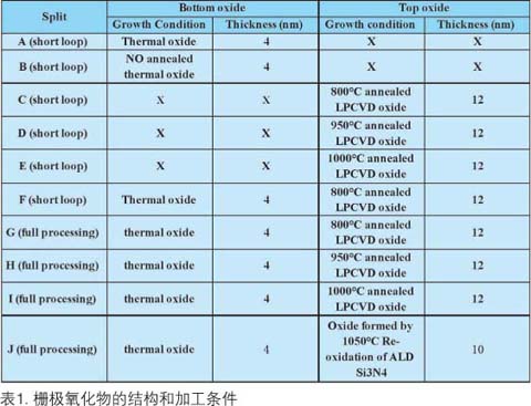 NROM中采用的SONOS NVM栅极结构为:4~7nm的热生长氧化物作为下层氧化物(BOX),~5nm的Si3N4作为电荷陷阱层,~10nm的LPCVD氧化物作为上层氧化物(TOX)。本研究中制作了70×20μm2的两类MOS电容。一类是短环加工样品,直接形成电容,没有经历整个标准NROM加工程序。另一类是全加工样品,此电容是在标准NROM加工程序过程中形成,作为测试键。全部样品都用n+多晶硅作为栅极。各种栅极氧化物和ONO栅极是在8英寸硅衬底上形成的,由NROM BOX类的热生长氧化物、NROM TOX类LPCVD氧化物、NROM类短环加工和全加工ONO栅氧化物组成。表1总结了BOX和TOX的结构与加工条件。下层热氧化物是在850℃下生长的,LPCVD氧化物是在780℃下生长的。所有氮化物层用LPCVD在650℃下形成,其厚度为~5nm,在ALD中生长的split J除外。
