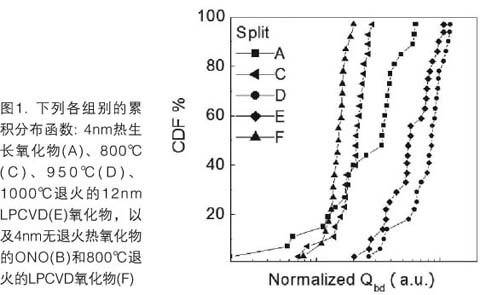 图1比较了split A、C、D、E和F的Qbd。从Weibull图可见,split F(ONO)和split C(800℃退火的LPCVD oxide)的Qbd是相当的。split A(热生长氧化物)的Qbd比split C和F的Qbd高约二倍。Split D(950℃退火的LPCVD氧化物)和E(1000℃退火的LPCVD氧化物)显示了相当的Qbd,且比其余的Qbd高得多。这一比较说明,LPCVD氧化物的质量能通过将退火温度从800℃提高到950℃而显著提高,观测到Qbd提高了5倍。但是,将退火温度进一步从950℃提高到1000℃时,增益微不足道。800℃退火LPCVD氧化物的ONO的Qbd与热氧化物的Qbd相当,说明在这种情况下,ONO的Qbd主要受TOX的Qbd限制。此外,将上层LPCVD氧化物的退火温度从800℃增加到950℃或更高时,Qbd会有明显提高。