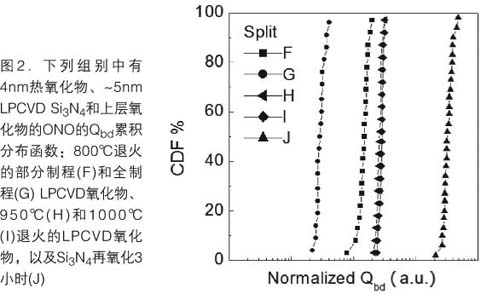 图2说明,具有ALD Si3N4再氧化形成的TOX一组(split J)比具有LPCVD氧化物的组高10倍左右。这表明Si3N4再氧化形成的TOX能极大地提高ONO的总Qbd,说明ONO的Qbd是由TOX主导的。