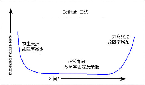 这曲线表示产品的典型使用寿命及故障率,从这曲线可看出由3部份组成…初生夭折(Infant mortality), 正常寿命(useful life) 及寿命终结(end-of-life) 3 部份。