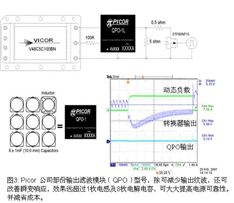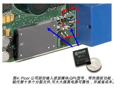 其他增加可靠性的方案还包括,优化系统配置,以减少元件数量。有些电源技术及拓朴,可以减少输出储能电容的数量,而又不影响瞬变反应,例如,Vicor 的V•I-晶片电压转换模块﹙VTM 及BCM﹚,采用革命性的专利正弦振幅转换技术,能提供电容倍增能力,视乎降压的倍数,一枚1µF 的电容放置在VTM 的输入,便可代替多达1,000µF的负载点电容﹙图2﹚,另外,Vicor 的MicorRAM 及 QPO输出纹波衰减系列模块,亦可以有源方式改善负载瞬变反应,从而减少对负载点电容的倚赖﹙图3﹚,少用较易失效的电解电容,可靠性自然提高不少。采用较为整合的模块,亦可减少系统零件数量,对MTBF 值有正面影响。例如Vicor 的QPI 系列输入滤波模块,某些型号还整合了热插拔功能,可代替十多个分立元件,从而减少PCB 面积,成本,及提高系统可靠性﹙图4﹚。