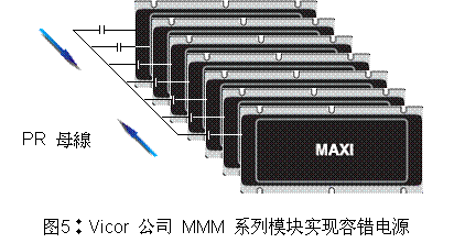 若系统不允许丝毫错误,如通讯基站、数据中心、航天应用等,惟有用冗余电源设计,才能满足要求。这概念即需要额外的电源作备份用,所以容许电源系统于模块或零件的层面上,有某程度上的失误,换句话说,即使其中一部份电源损坏,剩下的部份马上可填补损坏的部份,系统还可无间断地工作,但代价是增加成本及设计难度。采用模块实践的电源系统,较大的挑战为使它们均流地运作,同时要保持备用状态。有些电源模块拓朴,如Vicor 之QR/ZCS ﹙拟共振/零电流开关﹚,其变频工作方式,加上专有的双向同步交连埠,特别适合实践N+1的容错电源系统﹙图5﹚。有别于其他拓朴,Vicor 的方式无需使用分流器,没有反遗电路以影响稳定性,而且对动态负载亦可均流,可使额外元件数目减至较少,进一步增加系统的可靠性。