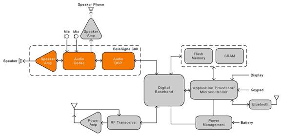 图2: BelaSigna® 300 Hi-Fi音频处理器在手机和免提电话中的应用电路图