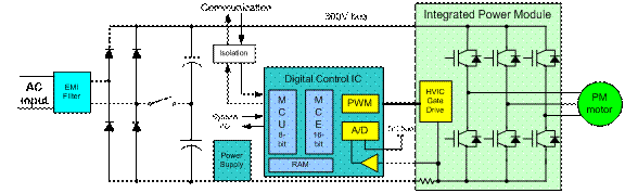 电器控制IC集成了采用直流母线电流测量的PMSM无传感器速度控制所需的所有控制和模拟接口功能。该集成电路上的模拟功能包括差动放大器、双采样和保持电路,以及直流母线分流低电压信号采样所需的12位A/D转换器。该变频电源模块集成了带有六个IGBT开关的高压栅极动IC。该模块包括用于电机电流测量和电源模块保护的直流母线分流。电机控制算法采用硬件执行,利用的是该集成电路的专用运动控制引擎™(MCE),而电器应用软件独立运行在集成在一起的8位处理器中。