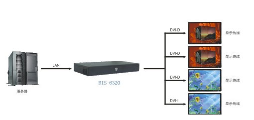 它可以通过4个DVI接口(1个DVI-I和3个DVI-D)输出数字视频信号到较新的高清晰显示设备,这些设备包括:等离子显示器、LCD显示器等。同时BIS-6320还支持显示终端的同步或者异步显示,四屏可以自动播放也可以四屏成一个画面,带来震撼的视觉效果。
