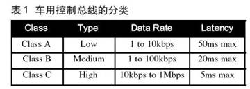 如表1所示,SAE较初定义了低、中、高速三类数据通信汽车网络。控制器局域网(CAN)和SAE J-1850一直占据着主流地位,但也不是唯一的总线体系结构。