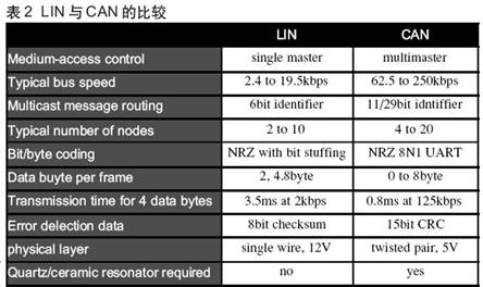 对某些机动车应用,如车体电子系统中的马达控制,甚至可以使用更低的总线。本地互连网(LIN)是一种UART基、单主、多从网络体系结构,原是为汽车传感器和执行器网络应用开发的。LIN为连接车内马达、开关、传感器和车灯提供了一种廉价的网络备选方案。LIN主节点连接LIN网络和高级网络(如 CAN),将网络的作用一直延伸到每个传感器和执行器(表2)。
