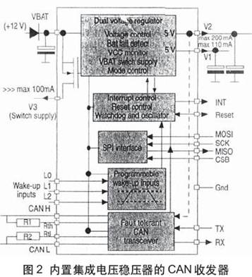 简单的物理层器件未必能胜任某些汽车应用。例如,所有汽车模块要求使用稳压电源。有时,一个本地开关或传感器会将模块唤醒,从休眠状态进入有源工作状态。该开关或传感器是以车辆电池工作的。为了简化车辆中物理层应用的电源设计,已研制出专用的电源IC,如Motorola的系统偏压芯片(SBC)族。其中 MC33389兼备汽车CAN连接的CAN物理层功能和稳压器功能,内置独立的看门狗定时器和本地唤醒电路,以较少元件求得较大的灵活性(图2)。在一个封装内组合这些功能需要先进的混合信号半导体工艺,如Motorola的SmARTMOSTM工艺。集成化设计降低了组装成本,提高了可靠性,还增加了设计的灵活性。
