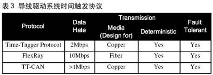 为了实现这类高功率控制系统,需要一种容错的、时间触发的体系结构。目前,在这个领域争夺领导地位的有三种协议。Flex Ray采用光纤,当然也能在铜线上工作,数据传输速率达10Mbps。另一类是TTP(时间触发协议)使用铜线,数据率仅2Mbps,但Vienna大学的研究人员正在开展使用光纤的探索。第三种协议TT-CAN,既支持“时间触发”应用,也支持“事件触发”应用。