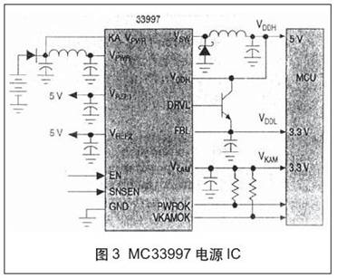 对动力链应用,电源IC(如Motorola的MC33997和MC33998)为电子控制单元(ECU),提供一套完整的电源系统解决方案。这此芯片设计成能承受恶劣的汽车环境-40℃~+125℃,而在6V~26.5V输入电源下工作,瞬时电压高达46V。MC33997和MC33998以其加电顺序、输出电压监测、管理功能和动力链应用的特殊保护功能为Motorola MPU中的芯核和I/O提供所需的电压。这些器件还支持备用模式,电源外部传感器及其它功能。