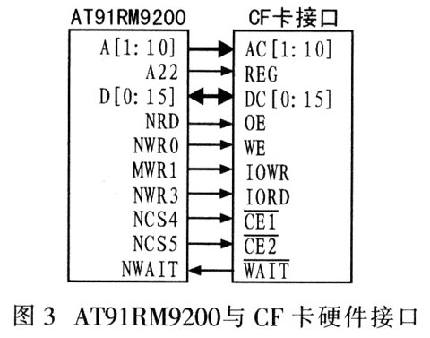 在图形界面的设计中需要运用到位图、字库等数据资源,系统通过FAT文件系统管理CF中数据,并且通过PC机将数据直接拷贝至CF卡。AT91RM9200与CF卡硬件接口连接如图3所示。