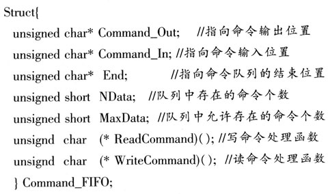 在应用程序设计中,使用多线程可更好的协调串口接收、图像显示、数据存储以及超时处理等操作。终端中基于POSIX的应用程序由图形显示与串口命令解析组成,由于Linux操作系统中不同的线程之间可通过全局变量传递参数,应用程序中使用了一个全局的循环FIFO作为两个线程之间的命令缓冲区,采用两个静态数据缓冲区用于存放串口传来的图像数据资源,数据缓冲区大小与LCD分辨率和像素深度有关。命令循环FIFO管理结构如下所示。