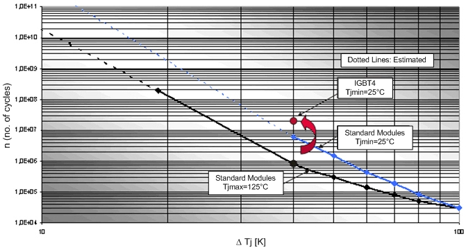 图1. 在接通时间约为1秒和电流约为标称电流条件下,1200V标准模块使用寿命图和EconoPACK模块的典型使用寿命。