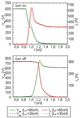 然而,如果较高的直流侧电压与增大的杂散电感同时出现,则需要通过增大外部门极开通电阻,降低开关速度,实现二极管的软开关。增大的外部门极电阻会使开通损耗增大。增加的杂散电感降低了IGBT与二极管的柔软度,但也为所有IGBT模块带来优化机会。