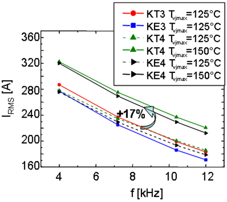 成功开发全新芯片的两个准则是实现低的静态和动态损耗。IGBT4技术还使芯片的允许工作结温提高25℃,达到Tvjop=150℃。