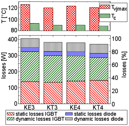 进一步通过IPOSIM计算,对比新器件与前代器件。首先,在结温为125℃条件下,计算8kHz频率下E3的较大Irms。接下来计算所有其他型号芯片在相同变频器输出电流条件下的损耗。图7概括了计算结果。E4模块的损耗大约比E3模块的损耗低3%,但与T3的损耗相当。T4的损耗与E4相比,降低约3%。
