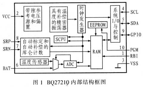 BQ27210的内部结构框图如图l所示。该器件可将计算得到的与电池充放电相关的数据存放在内部RAM中,这些数据可通过RBI上的电压予以保持,而EPPROM则用以保存永久性的用户数据信息。由于BQ27210内部集成有A/D转换器和温度传感器,因此要获得电池的电压、温度等参数,只需通过外部处理器对器件发出采集电压和温度控制命令即可,当芯片采样完毕后会自动将电压、温度测量值存入相对应的RAM寄存器中,再由外部处理器读取寄存器的内容。