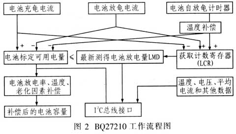 该芯片的较大的特点是在电池使用过程中能够实时监测电池的电量,并根据较新监测的电池电量值来更新RAM中寄存器LMD(电池较新放电电量)的参数,同时BQ27210还能保留更新后的参数,并将其存放在寄存器LMD中直到寄存器复位。在整个电池充电到放电终止过程中,BQ27210就是通过这种不断地监测并更新来获取电池电量相关的实时参数。BQ27210的工作流程如图2所示。