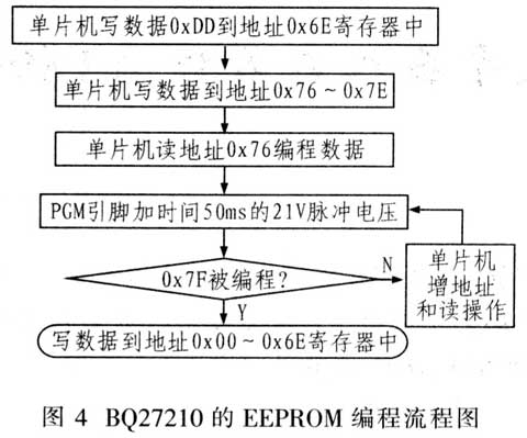 软件设计分为两个部分,一是C805lF304单片机端口I/O的初始化配置。主要通过正确配置端口I/O交叉开关寄存器XBR0,XBRl,XBR2中的值,使数字交叉开关使能.同时把PO.0、P0.1端口分配给SDA、SCL。将0X00赋值给寄存器XBR0,使交叉开关不跳过任何一个引脚,仅将寄存器XBRl的位2置于“l”就使SDA,SCL连接到引脚上。二是BQ27210的EEPROM初始化配置。实际上,通过I2C总线接口就能将正确的配置信息固化到EPPROM中,这些重要信息包括计算得到的初始电池放电量、EDVl,EDVF门限电压、初始待机负载电流、放电率补偿常数、温度补偿常数等。BQ27210每经历一次强复位都会把更新的EEPROM信息强制写入RAM相应的寄存器中。但值得注意的是在对EEPROM数据区写入任何数据前,必须保证编程模式使能,通过把数据OXDD写入EE_EN寄存器地址0X6E后,将激活编程使能模式,同时在PGM引脚上加一个持续时间为50ms的2l V脉冲信号,这样即可将所需数据写入EEPROM的合适地址中。图4为BQ27210的EEPROM编程流程图。