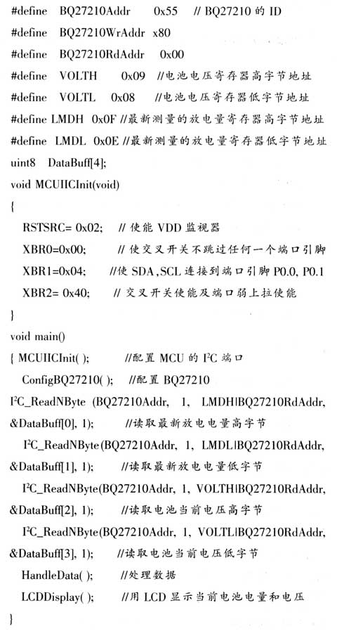 现给出单片机C805lF304通过I2C总线协议读取BQ272lO内部RAM存放的较新电池放电量和电池电压信息的部分程序代码: