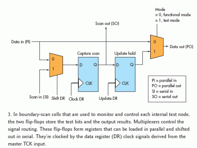 图2表示了基本的边界扫描结构。要测试的IC逻辑块被连接到多个边界扫描单元。当生产该芯片时,这些单元是与IC电路是一起建立的。每个单元可以监测或激励电路中的一个点。采用触发器和多路复用器,该单元可以用于任何并入/并出或串入/串出操作(图3)。