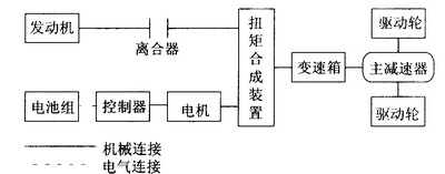 并联式混合动力汽车的驱动系统结构见图1。发动机通过机械传动装置与驱动桥连接,电动机通过动力复合装置也与驱动桥相连,汽车可由发动机和电动机共同驱动或各自单独驱动。并联式混合动力电动汽车的结构形式更像是附加了一个电动机驱动系统的普通内燃机汽车.电动机起“调峰”作用:当汽车运行工况所需的功率超过了发动机的功率时,电动机从电池取得电能产生电磁力矩,并向驱动桥提供额外的驱动功率.有的并联式混合动力电动汽车也有发电机,但其主要作用是向电池充电,以保持电池的荷电状态(SOC)。