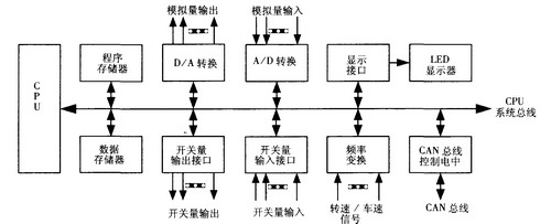 硬件系统(图3)以微处理器CPU为核心以及必要的外围电路构成.其中CPU为高性中央处理单元,具有丰富的功能和高速的处理能力,可快速进行大量的数学和逻辑运算,完全能满足本电控系统的设计要求.程序存储器中存放着实现各节点功能的软件用以控制各节点的功能实现。数据储存器电路用于系统内存扩展,复杂的程序控制和运算需要大量的中间变量和缓冲区,内存的扩展解决了这一问题.D/A转换电路用于将处理后的数字信号转换模拟信号输出,主要应用于输出控制和信号的远程转换,A/D转换电路用于对系统的模拟量进行采集,即将被采集的模拟信号转换为数字信号,所设计的转换电路的转换速度可达5微秒/路,分辨率为1/4096,每个节点可同时进行8路A/D转换,完全可满足任务书的技术要求.开关量输出接口用于输出节点的位控制命令,具有灵活的输出控制,可直接或间接满足各种功率输出的控制要求,在本系统中的主要位控制信号有发动机的供油、空调、大小电机启动选择等信号。