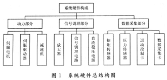 根据硬件部分所要实现的功能,可以将系统硬件的构成分成三大部分(如图1所示):第一部分是动力部分,主要由伺服电机、伺服驱动器和减速机组成,主要负责提供动力和扭矩带动踏板运动;第二部分是信号调理部分,主要由放大器、信号调理电路和直流稳压电源组成,主要负责对传感器采集的和踏板本身的原始电信号进行调理转换;第三部分是数据采集部分,主要由扭矩传感器、压力传感器、运动控制卡和数据采集卡组成,主要负责将力特性转换为电信号、对所有电信号进行高速同步采集记录和对整个运动过程实施监控。下面将对各个部分做详细的介绍。