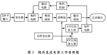 为了给踏板提供0~30 V的独立供电,本系统选用DH1718E-4型双路跟踪稳流稳压电源,具有恒压、恒流工作功能,且这两种模式可随负载变化而进行自动转换。另外DH1718E具有串联主从工作功能,在跟踪状态下,从路的输出电压随主路而变化。这对于需要对称且可调双极性电源的场合特别适用。图3为稳压直流电源工作原理图。