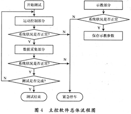 悬挂式电子油门踏板的主控软件采用了NI公司的LabVIEW虚拟仪器开发平台进行编写,主要由四个部分构成,分别是示教部分,主要负责更换踏板之后的示教过程;运动控制部分,主要负责对伺服电机的精确控制;数据采集部分,在电机带动踏板运动到指定位置时进行同步高速采集;系统监测部分,在整个测试过程中对电机状况和主控软件运行状况进行监控。主控软件的总体流程简图如图4所示。