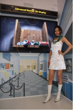 凭借着在三维显示领域先进的研发能力,友达今年六月开发出全系列无需佩戴特殊眼镜,从4.3寸、8寸、17寸到65寸采用不同技术的三维立体显示平板。其中全球较大的65寸三维立体显示屏,具备12个视点,藉由视差屏障 (barrier type),让人体左右眼对影像产生不同距离的三维效果,加上友达高亮度三维背光设计可将亮度提升140%,超大画面的立体影像效果未来可应用于公用显示器之商业广告或家庭娱乐、教育等目的,提供消费者身临其境的逼真感受。